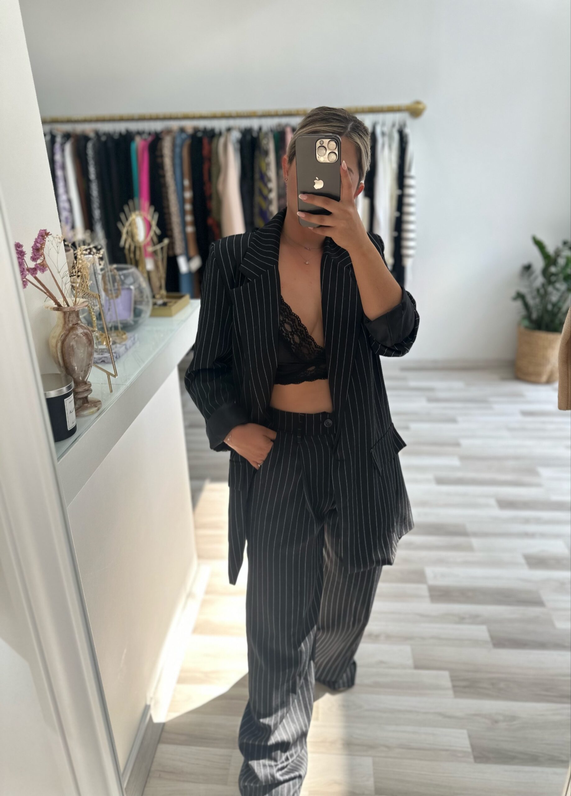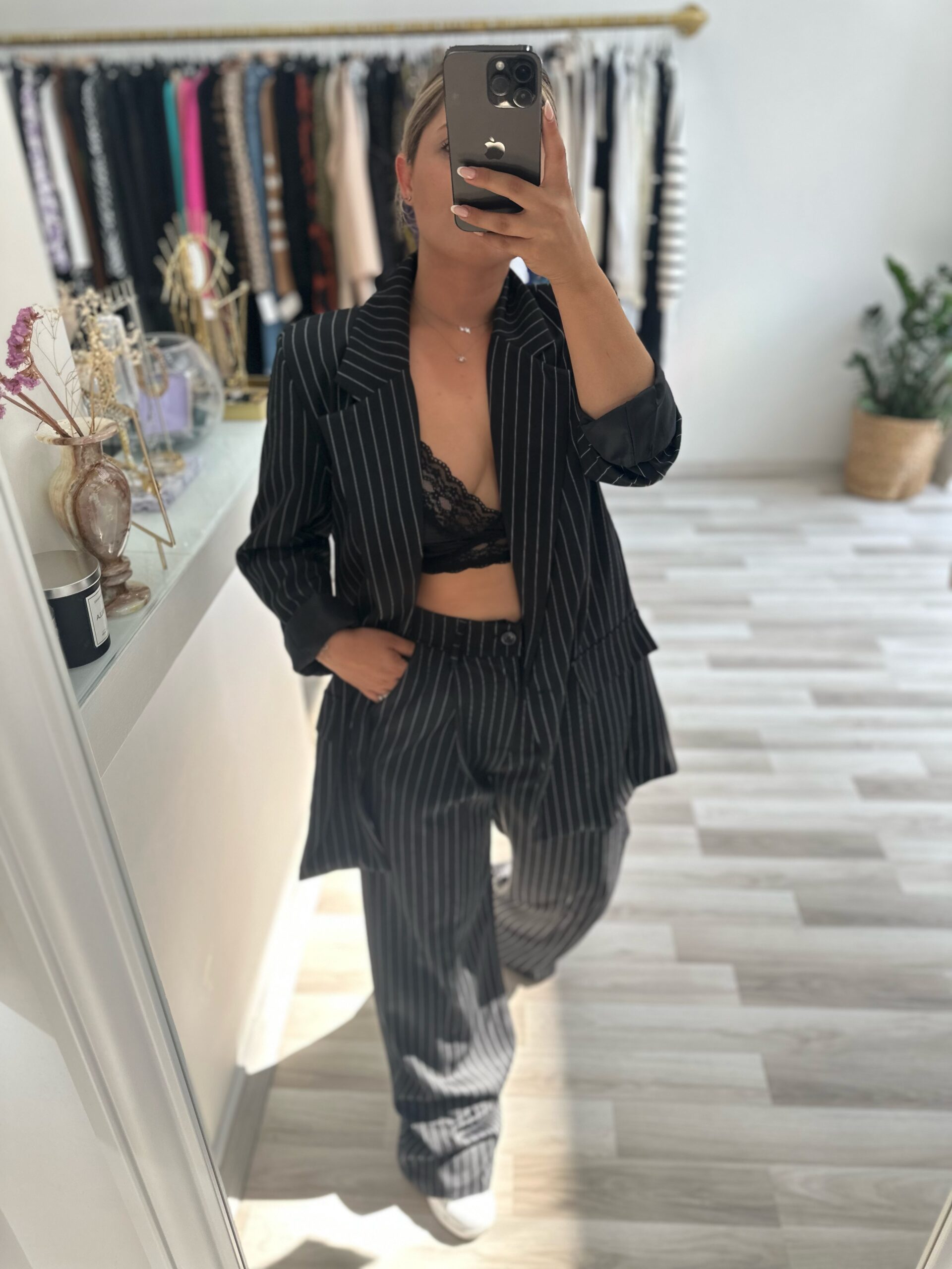 Το blazer καλύπτει τους γοφους και το παντελονι είναι σε Α’γραμμη με πιετα στο μπροστινό σημείο και τσεπες πλαϊνές
